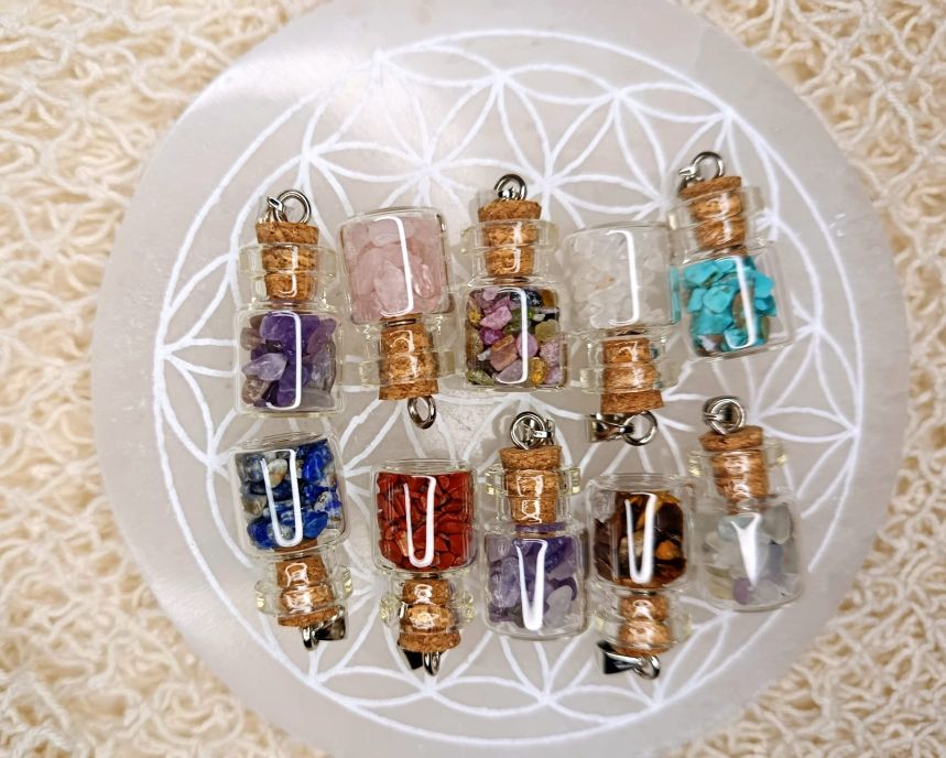 Botellas de Cristal Artesanales para Esencias y Energías Pequeñas botellas de cristal transparente, perfectas para guardar tus esencias, aceites aromáticos o cristales pulverizados. Su tamaño compacto las hace ideales para llevar contigo, crear rituales personalizados o decorar tu espacio con intención. Cada botella captura la luz natural, amplificando la energía de lo que contenga en su interior. Diseñadas con materiales de calidad, son el complemento perfecto para quienes buscan conectar con la naturaleza y potenciar sus prácticas de bienestar.